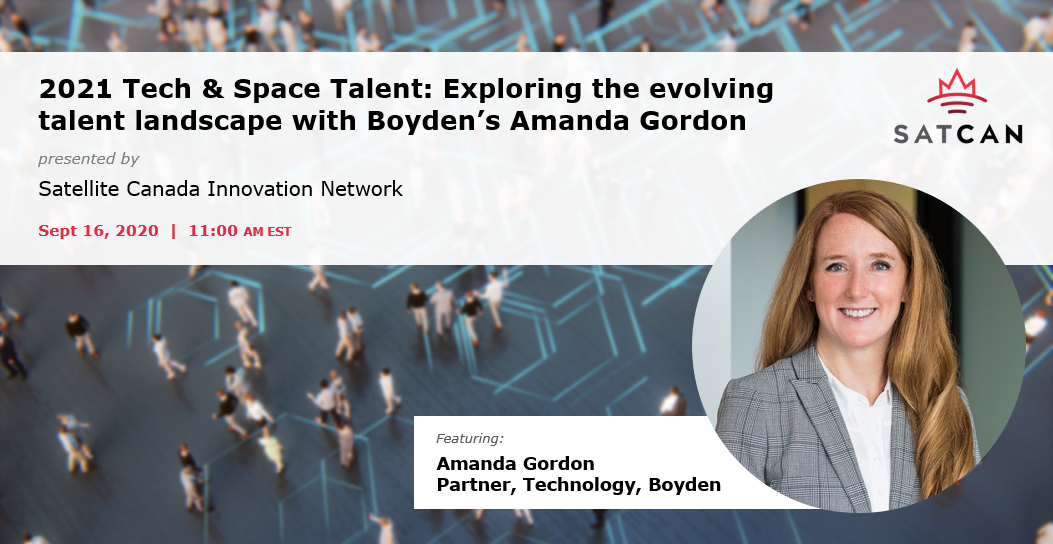 On Sept 16, 2020, SatCan is pleased to welcome Amanda Gordon for a discussion on all things space and tech to get her insights into the career landscape as we head towards 2021. Amanda Gordon is Partner at the top global search firm Boyden. With over a thousand hires under her belt and over 20 years working in the tech space, Amanda Gordon is known as an expert in finding and hiring the best. Amanda is a Board Member/Chair Human Resources and Talent Committee for the Kanata North Business Association. She is also Executive-In-Residence for University of Ottawa's Entrepreneurship Program, and an active member of the Human Resources Leadership Council for Canada’s largest technology park.
