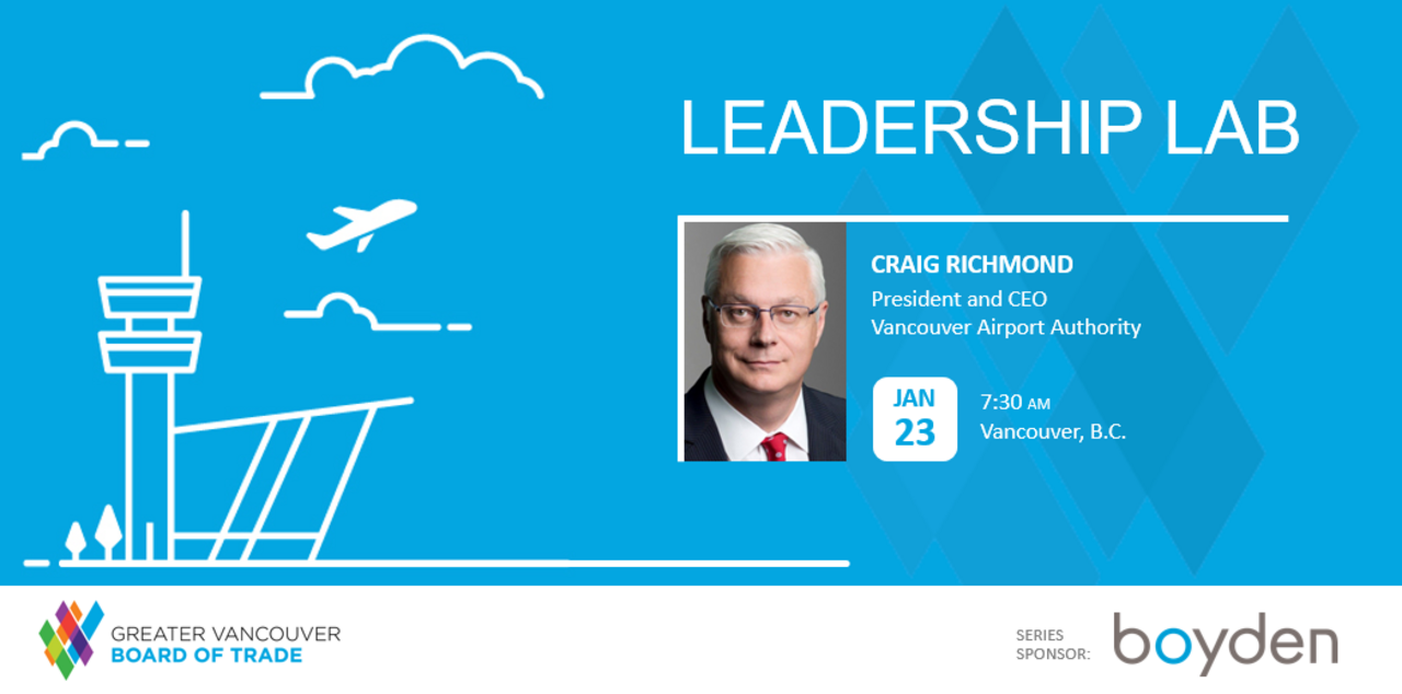 To kick off the series, we are pleased to announce that Vancouver Airport Authority's President and CEO, Craig Richmond will sit down for a fireside chat with the Greater Vancouver Board of Trade's President and CEO, Bridgitte Anderson. Recognized as a global leader, Craig will share his insights as the driving force behind YVR.