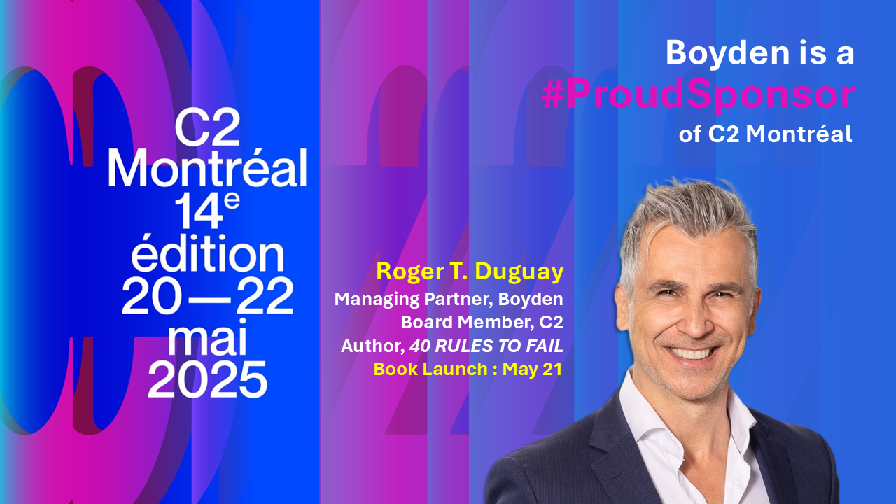 Boyden is a proud sponsor of C2 Montréal, and our very own Roger T. Duguay - Managing Partner at Boyden / C2 Board Member / Author, 40 RULES TO FAIL, Book Launch : May 21 - will be on-site to engage with visionary leaders and drive the conversation forward. Ready to lead, innovate, and disrupt? This is where it starts.