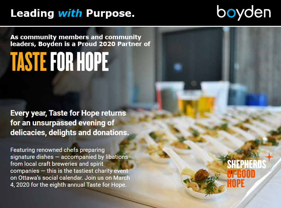 On March 4, join Shepherds of Good Hope, Boyden and fellow sponsors to experience the foodie event of the year. A selection of renowned Ottawa chefs will be serving samplings of sweet and savory delicacies. Enjoy a glass or two of wine, beer, or specialty cocktails and peruse exciting items and adventures that could be yours in our silent and live auctions. Eat, sip and bid your way through the night, all in support of Shepherds of Good Hope.