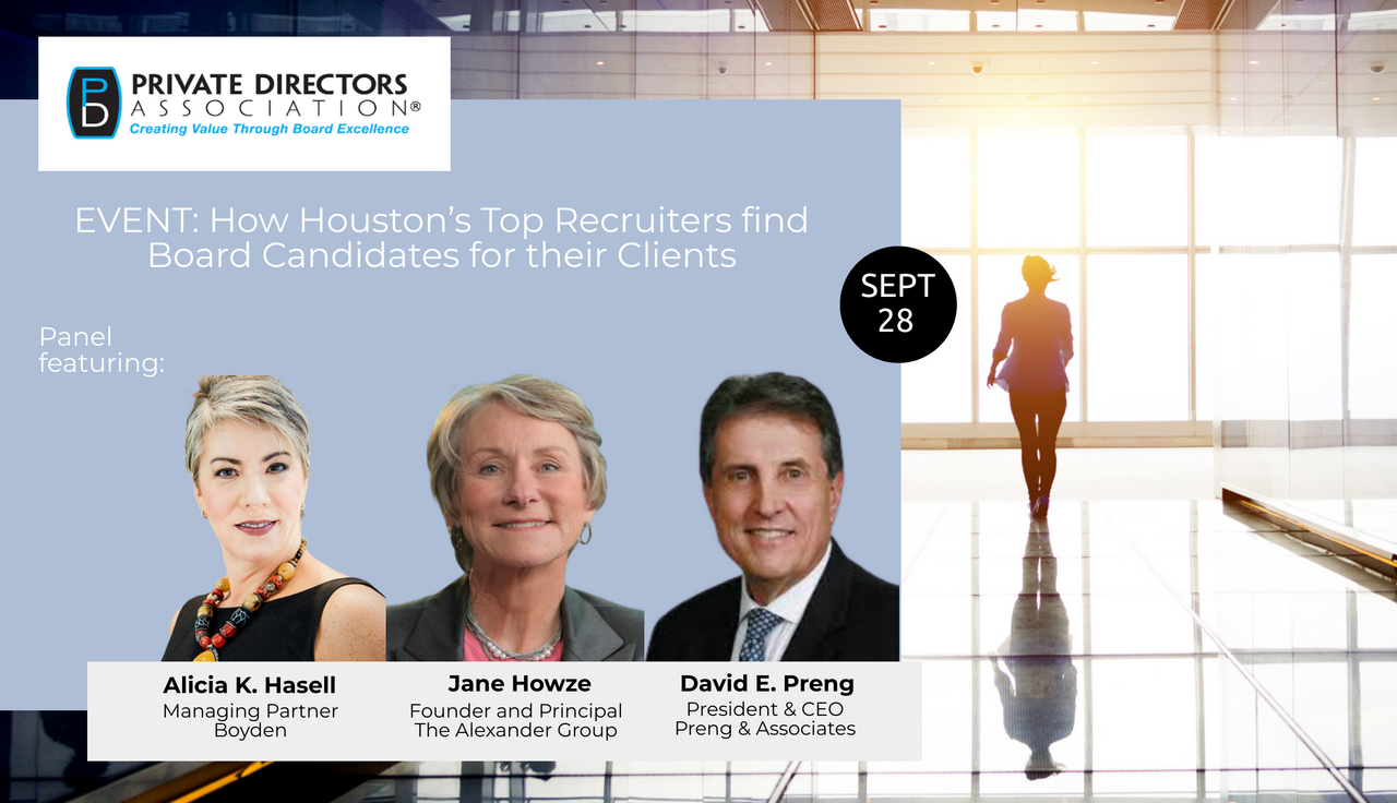 The Houston Chapter of the PDA is bringing three top recruiters, including Boyden’s Alicia Hasell, to talk about how retained search firms source candidates for companies and to share examples of how board positions are filled in less conventional ways. These recruiters have a long history of working with corporations and 501.c.3. organizations to build better boards and find the best candidates.