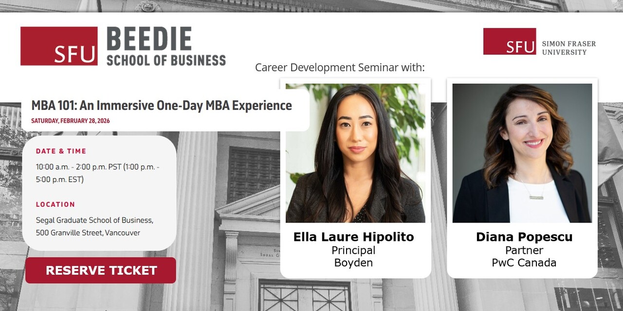 Spend a day with SFU Beedie industry leaders, accomplished faculty, and alumni who’ve turned their MBA into career breakthroughs. You’ll participate in MBA-style case discussions, explore frameworks for complex business challenges, and connect with people who understand your ambitions.