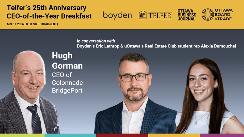 Telfer School of Management proudly marks the 25th anniversary of its CEO-of-the-Year Breakfast with a special conversation featuring Hugh Gorman, President and CEO of Colonnade BridgePort and the 2025 Ottawa Business Journal and Ottawa Board of Trade CEO of the Year.