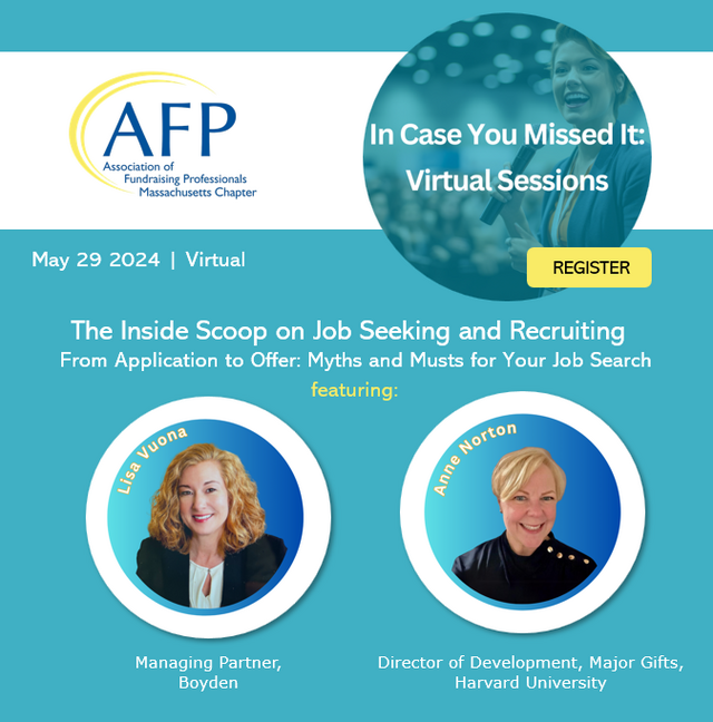 Lisa Vuona, Boyden Managing Partner, joins Anne Norton, Director of Development of Major Gifts at Harvard University, for a program session titled 'From Application to Offer: Debunking Myths and Highlighting Essentials for Your Job Search'.