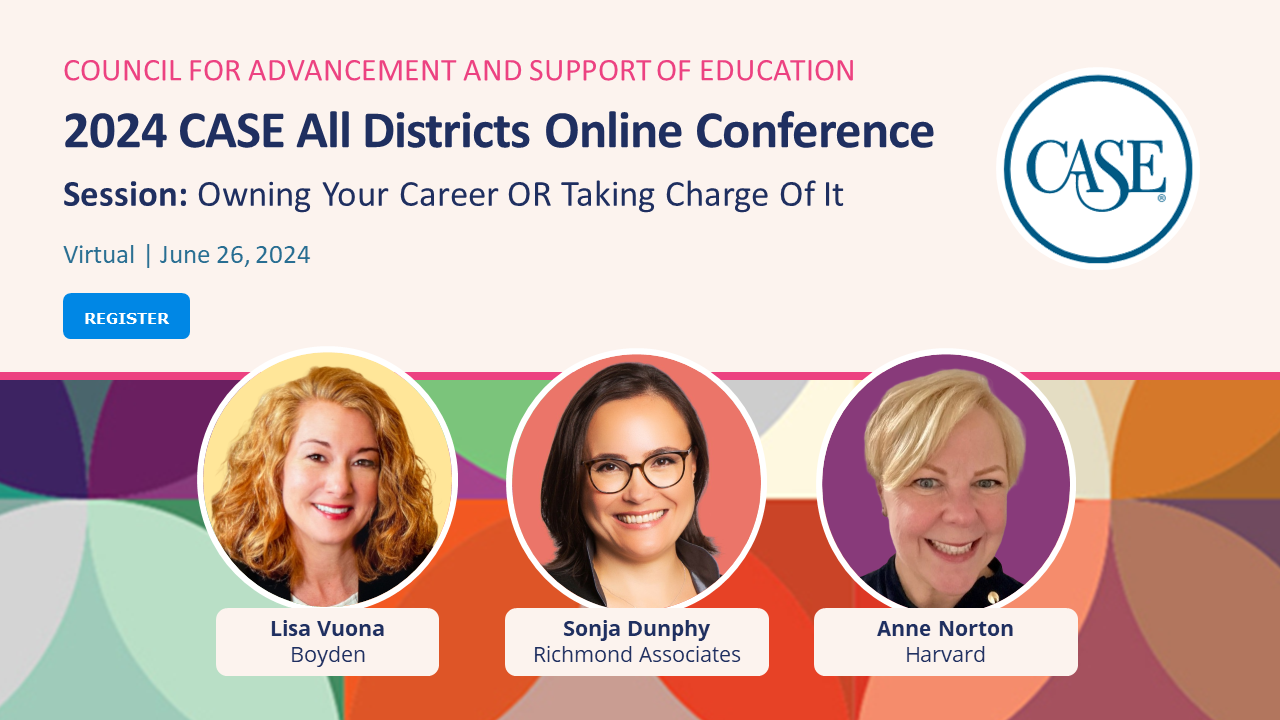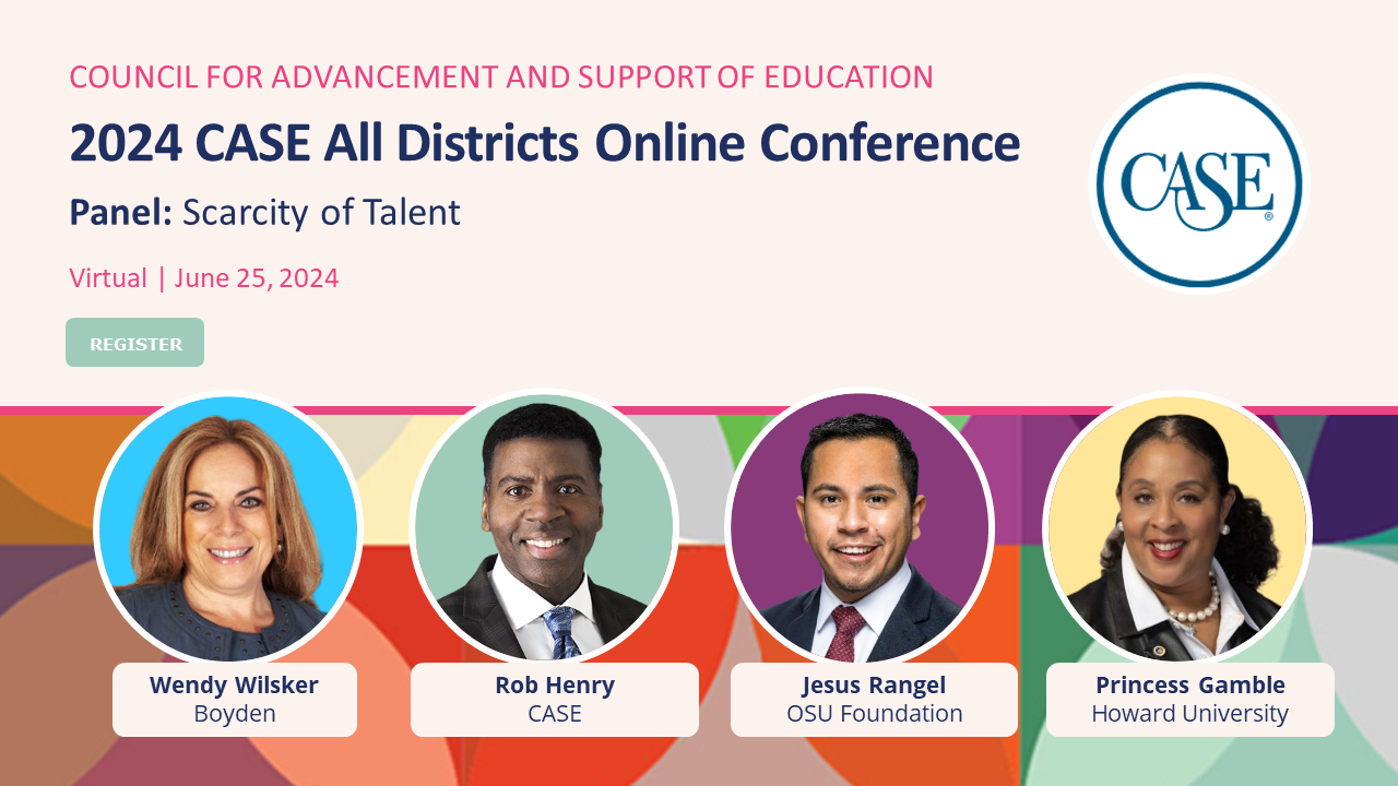 With 30+ live sessions sourced from the best of the 2024 district conferences, the CASE All Districts Online Conference brings insights and expertise from colleagues across advancement disciplines, experience levels, and borders - this annual event is not to be missed. On June 25, Boyden Managing Partner, Wendy Wilsker joins as speaker for Scarcity of Talent panel discussion with experts Rob Henry (CASE), Jesus Rangel (Oregon State University Foundation), and Princess Gamble (Howard University).