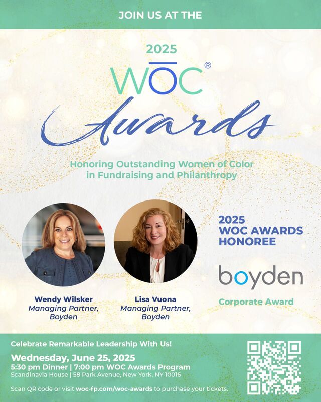 We are proud to share that Boyden will be honored with the Inaugural Corporate Award at the 5th Anniversary Women of Color in Fundraising and Philanthropy (WOC)® Awards.