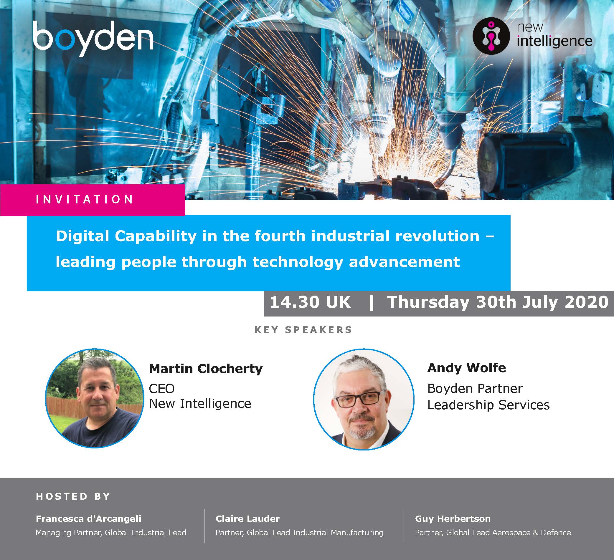 The Boyden UK Industrial Team and New Intelligence will be hosting a live interactive event - Digital Capability in the fourth industrial revolution, leading people through technology advancement.