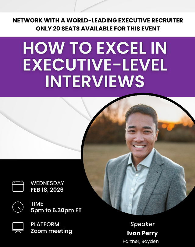 Join Ivan Perry, Partner, Boyden, for an exclusive senior-level virtual networking session focused on mastering executive-level interviews.