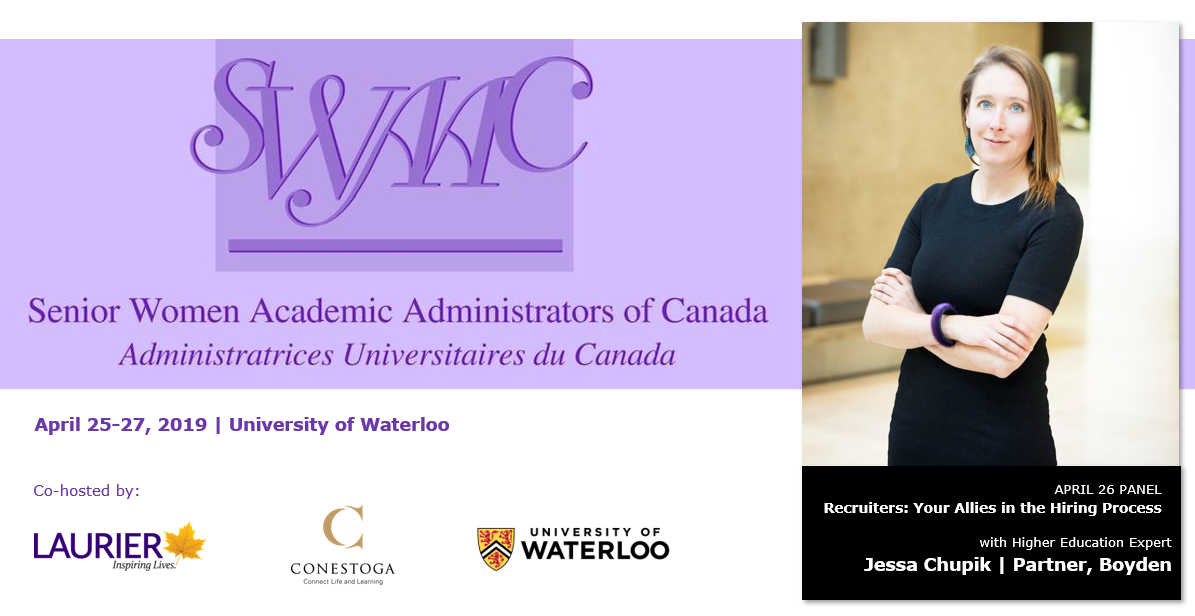SWAAC 2019 is co-hosted by Conestoga College, Wilfrid Laurier University, and the University of Waterloo on April 25, 26 and 27. The conference will feature distinguished speakers, including Elizabeth Nyamayaro (HeForShe), Shari Graydon (Informed Opinions), and a President's Panel featuring female higher education leaders from across the country.  Boyden Social Impact Partner and Higher Education Expert, Jessa Chupik, joins an esteemed group of SWAAC speakers to lend her insights in April 26th panel, Recruiters: Your Allies in the Hiring Process
