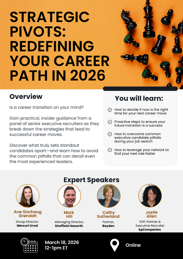 Join a panel of four distinguished AESC-member executive search consultants, including Cathy Sutherland, Partner, Boyden, as they share real-time insights on how top executives are successfully navigating career transitions today. Drawing on their frontline experience advising boards and placing senior talent across industries, they will explore what it takes to reposition yourself effectively in 2026’s competitive landscape.
