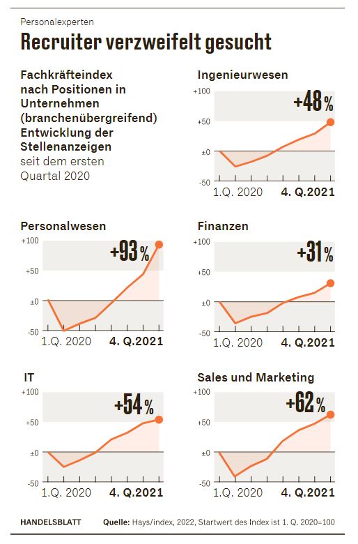 Verglichen mit Vor-Coronazeiten stiegen laut Hays die Stellenausschreibungen für Personaler im vierten Quartal 2021 um 93 Prozent. Die Nachfrage nach IT-Fachkräften kletterte im selben Zeitraum um 54 Prozent, im Ingenieurwesen waren es 48.