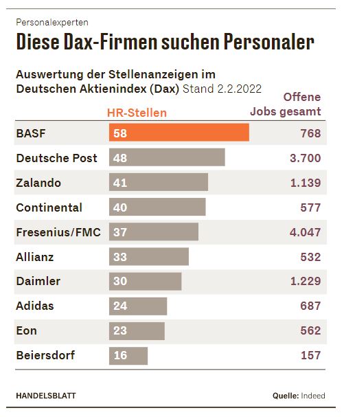 Die Konzerne mit den meisten offenen Personaler-Stellen sind BASFDeutsche Post und Zalando. Bei Beiersdorf fällt sogar jeder zehnte ausgeschriebene Job in den HR-Bereich. BASF erklärt auf Anfrage die vielen Vakanzen in dem Bereich mit einer internen Umstrukturierung. Bei Zalando sind es „ehrgeizige Wachstumsziele“ des Unternehmens, die für die erhöhte Nachfrage sorgen.
