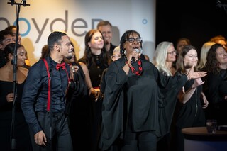 Back on the big screen, the IET was close to bringing us instantaneous communication with Jeanette at the ISS. To embellish the electric atmosphere and create history, Nick introduced, as a surprise to his team and Jeanette, the 45-strong London International Gospel Choir, singing Jeanette's launch song, "Rise Up" by Andra Day, against a powerful and highly emotional video featuring Jeanette’s journey to the ISS from NASA’s Cape Canaveral base in Florida.