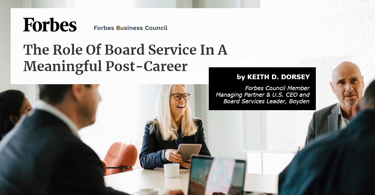 For me, a central activity of my post-career is giving back my expertise and guidance through serving on boards of directors. Perhaps you, too, have expert wisdom, perspective, skills and knowledge that only you can offer and want to share with other leaders and companies. Nonprofits, private ventures and public companies all look to their boards of directors to oversee, advise and govern their operations to help them efficiently and effectively serve their stakeholders. In exchange, I've found you can gain a sense of impact, fulfillment and possibly even ongoing income.