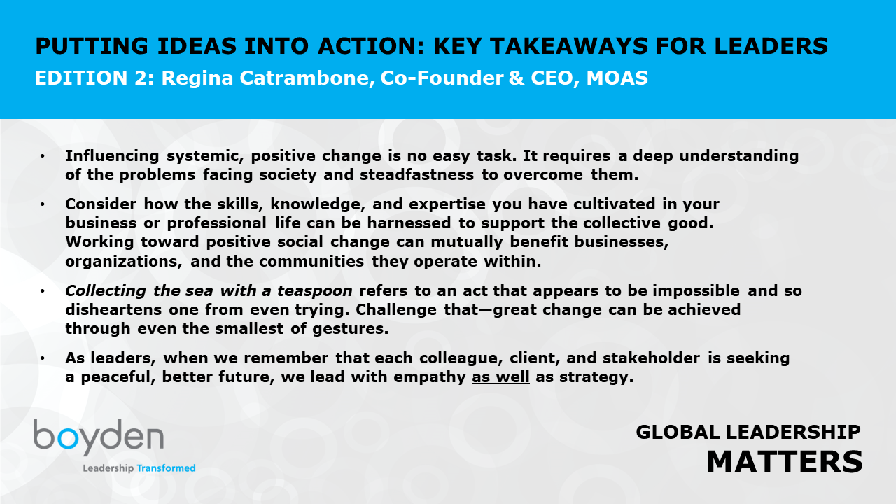 Regina spoke with Boyden’s Alain Pescador about MOAS’ first decade of high-impact work, humanity’s shared responsibility to care for one another, and the launch of her new book “Raccogliere il mare con un cucchiaino” or “Collecting the sea with a teaspoon.”
