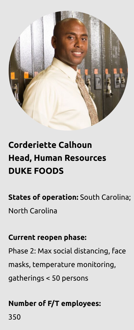 Calhoun:  Since we produce food, we were categorized as an essential business. In that sense, our return to work is essentially what we are already doing. The challenges are always to reach 100% monitoring of sickness, conduct testing, and ensure a safe return-to-work of an employee who has been ill.