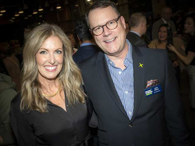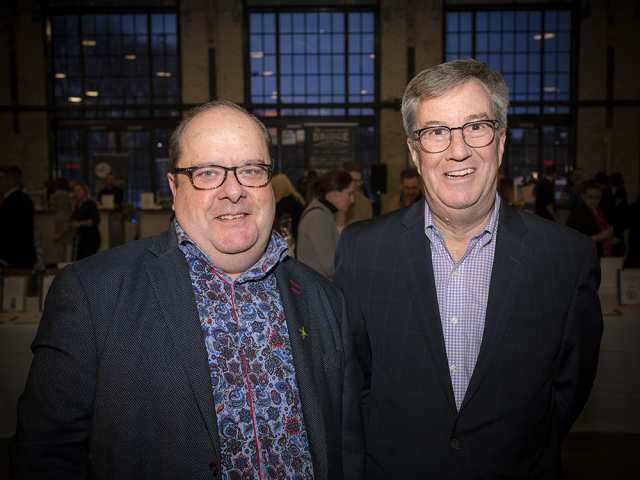 John Caminiti, partner with Boyden Social Impact Practice, the VIP event sponsor, addresses the crowd at the pre-event with Deirdre Freiheit, president and CEO of Shepherds of Good Hope and the Shepherds of Good Hope Foundation.
