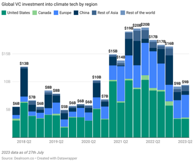 - While foodtech is one of the main VC funding segments, attracting $30bn in 2022, it experienced a stronger slowdown than many other sectors; late stage and breakout stages primarily accounted for a 70 percent drop in Q1 2023 vs. Q1 2021, with early stage showing more resilience. In H1 2023 it ranked in the top six in funding, attracting $7bn from VCs.