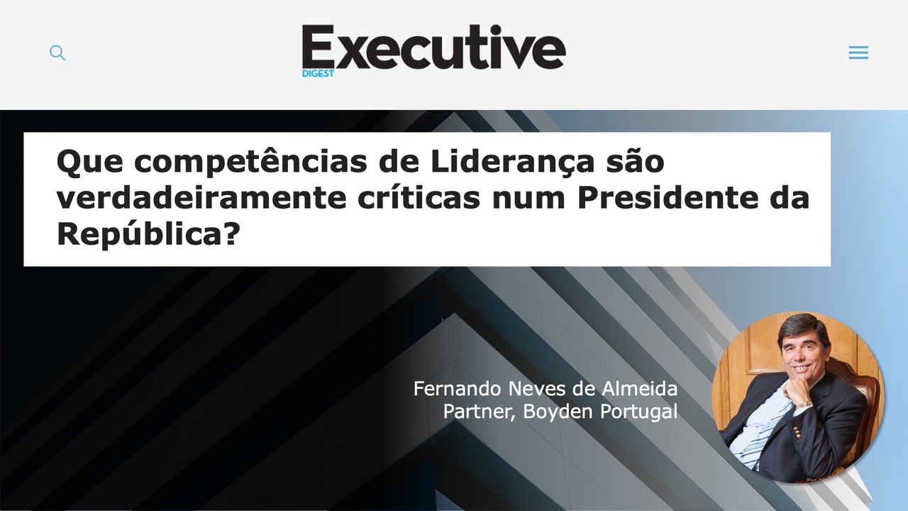 Neste artigo publicado na Executive Digest, Fernando Neves de Almeida, Partner da Boyden Portugal, destaca as competências de liderança que considera essenciais para o cargo de Presidente da República, sublinhando a importância de unir a sociedade, agir com independência ética e projectar uma visão estratégica para o país.
