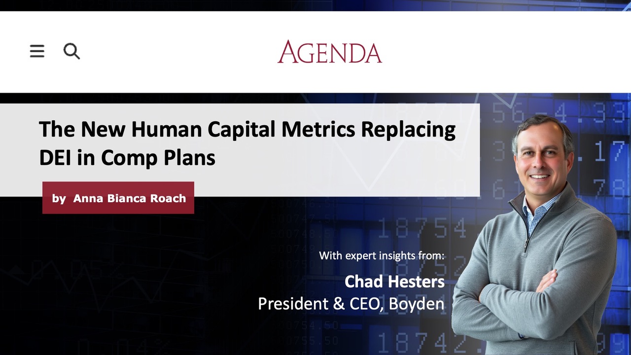 This article explores how companies are shifting away from traditional DEI‑focused compensation metrics and instead adopting broader human‑capital‑driven performance measures, such as workforce health, employee engagement, and organizational readiness. Chad Hesters, CEO of Boyden, notes that compensation frameworks have become more sophisticated, with human capital metrics increasingly designed to evaluate workforce health, performance, risk, and future readiness. Even as DEI‑specific targets decline across executive compensation plans, the emphasis on people‑related metrics remains strong as companies adapt to a rapidly evolving labor landscape.