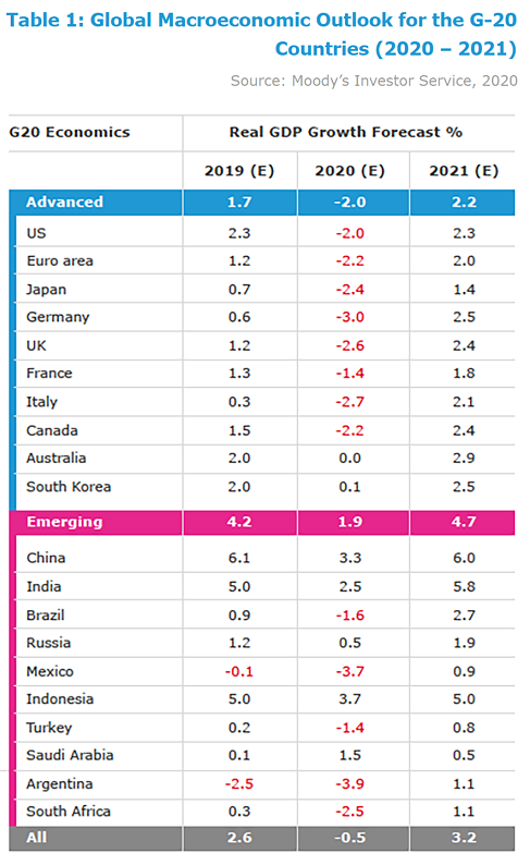 As cases of coronavirus keep spiking, disruptions to the global economy are increasing. As of March 27th 2020, Moody’s research has cut its global GDP growth forecast to -0.5% (Table 1). The number is uncertain more than ever though as the growth will depend on a number of factors including the severity and length of the outbreak, how quickly spending recovers when it abates, and the effectiveness of monetary and fiscal policy in providing support.