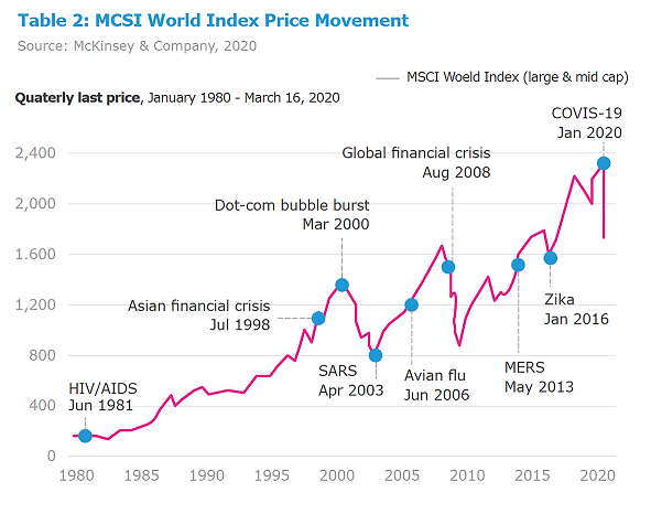 The consequences of the pandemic for economies, industries, MSCI World Index (large & mid cap) and service sectors are considerable. Volatility is one of the main challenges for wealth managers. According to the MSCI World Index, the approximate 30% drop from peak value in less than one month is comparable only to the 2001 collapse of the tech market, which saw a 44% drop over four years, and the global financial crisis in 2008, which saw a 40% drop in six months (Table 2).
