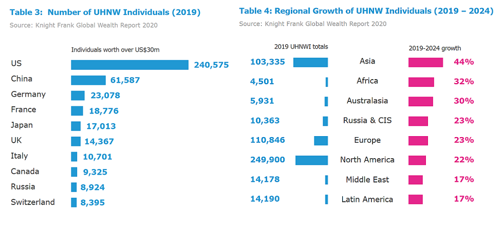 Knight Frank estimates suggest that the world’s UHNW population will increase 27% by 2024. Specifically, Asia's ultra-wealthy population is forecasted to grow by 44%, followed by Africa at 32%. North America is expected to continue to dominate in terms of gross number of UHNW individuals, with growth of 22% forecasted in the region over the next five years (Table 4). These estimates do not take into consideration the global slowdown due to the Covid-19 pandemic.