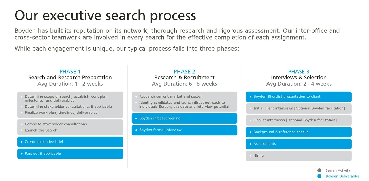 Retained search is a premium, partnership-based model, most often used for C-suite, VP, board, and other mission-critical roles, especially when discretion is a priority. The client pays an upfront fee to engage a search firm exclusively, trusting them to act as a strategic advisor. Retained search firms like Boyden invest deeply in understanding the client’s culture, leadership needs, and long-term goals, and offer leadership consulting. We conduct rigorous research, source passive candidates, and take a confidential approach. Our process is methodical and yields highly vetted candidates.